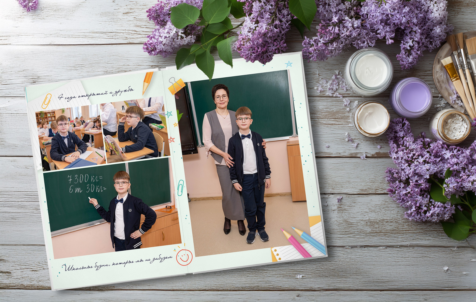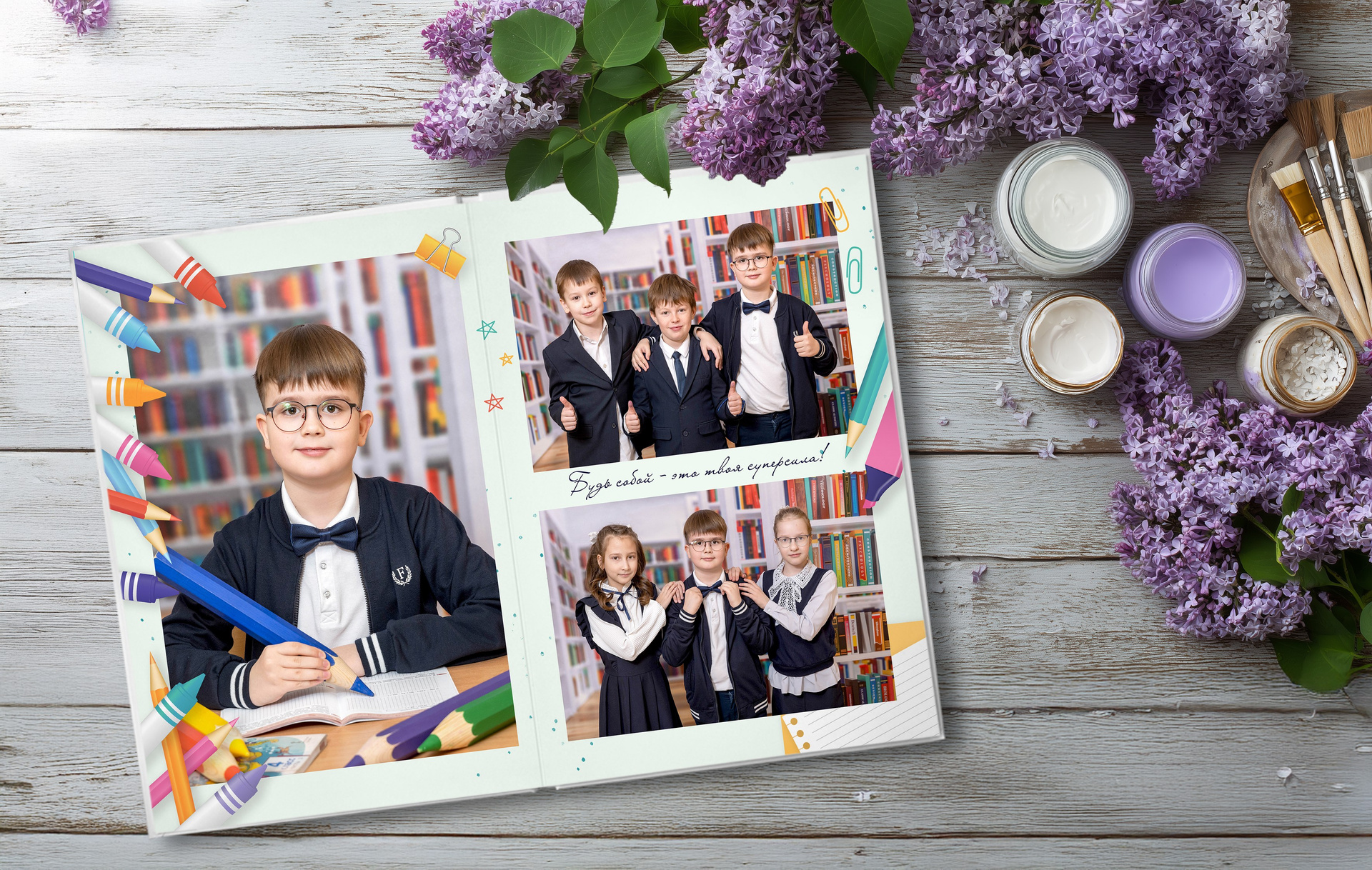 -Персональный разворот с крупным портретом вашего ребенка (формат А4) и две групповые фото с его друзьями.